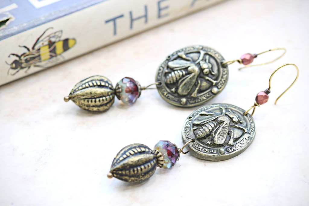 Inspired by the effects our bee population has on seed production in nature, I have created these artefact earrings showcasing the beauty of our furry insect friend and great work they do to sustain our environment.