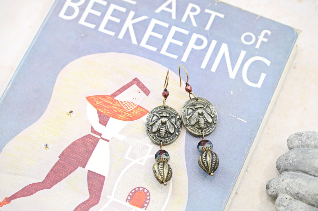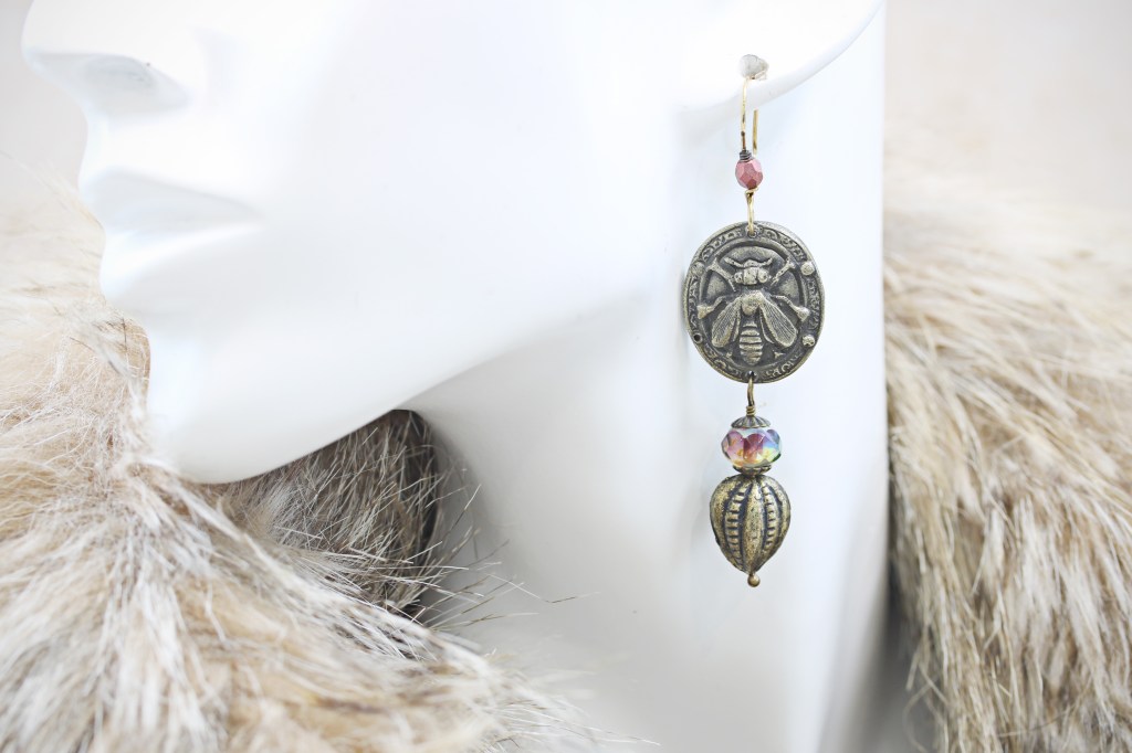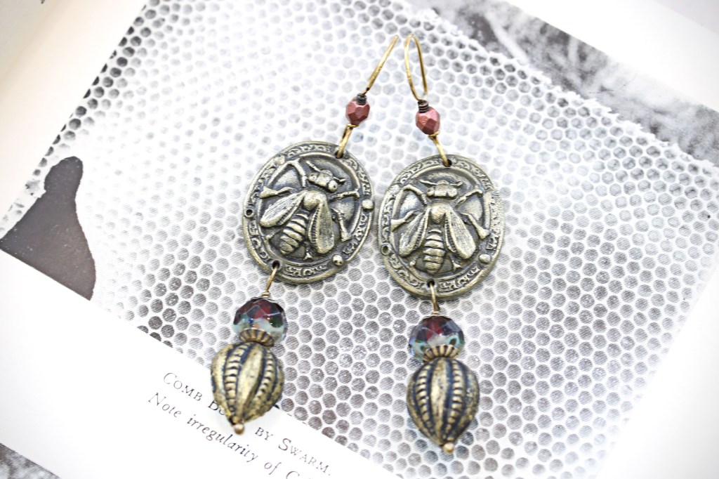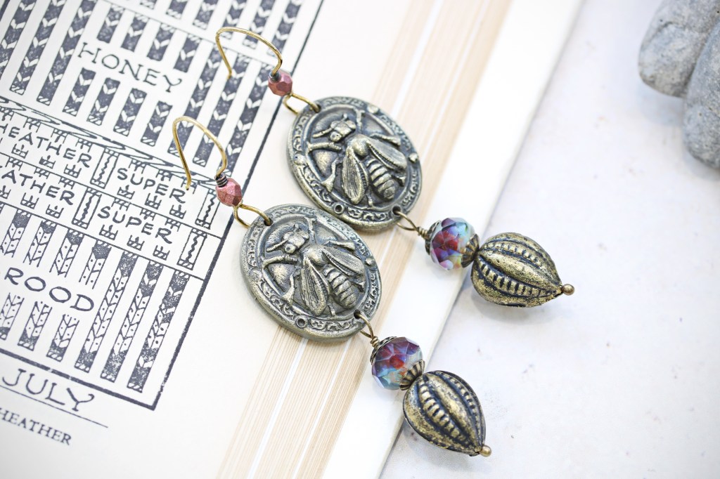 Brass cold metal cast earrings featuring a bee within an ornate frame with Czech glass purple rainbow bead and Tibetan Fair Trade hollow metal bead in the shape of a seed.