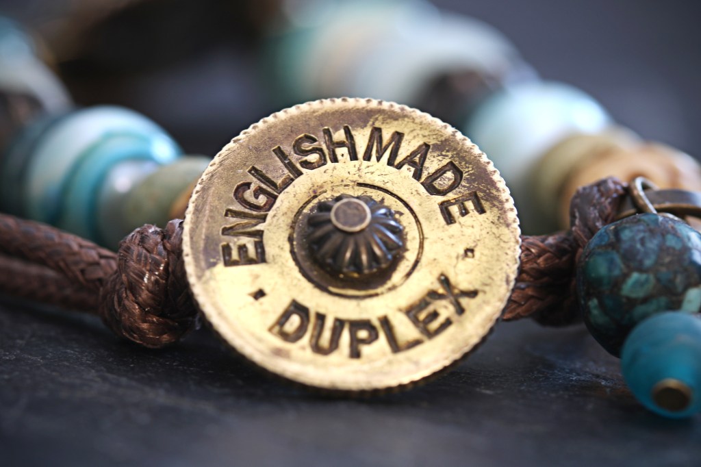 From my collection of lost and broken treasures and my own hand made ceramic pottery beads, I have given new and forgotten objects meaning and purpose in the form of fashionably rustic bracelet with salvaged micro mosaic brooch, stones, beads and for the toggle a repurposed antique oil lamp wick raiser – embossed English Made – Duplex. This one is themed in aqua blues and neutral browns and beiges.