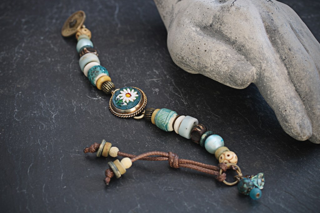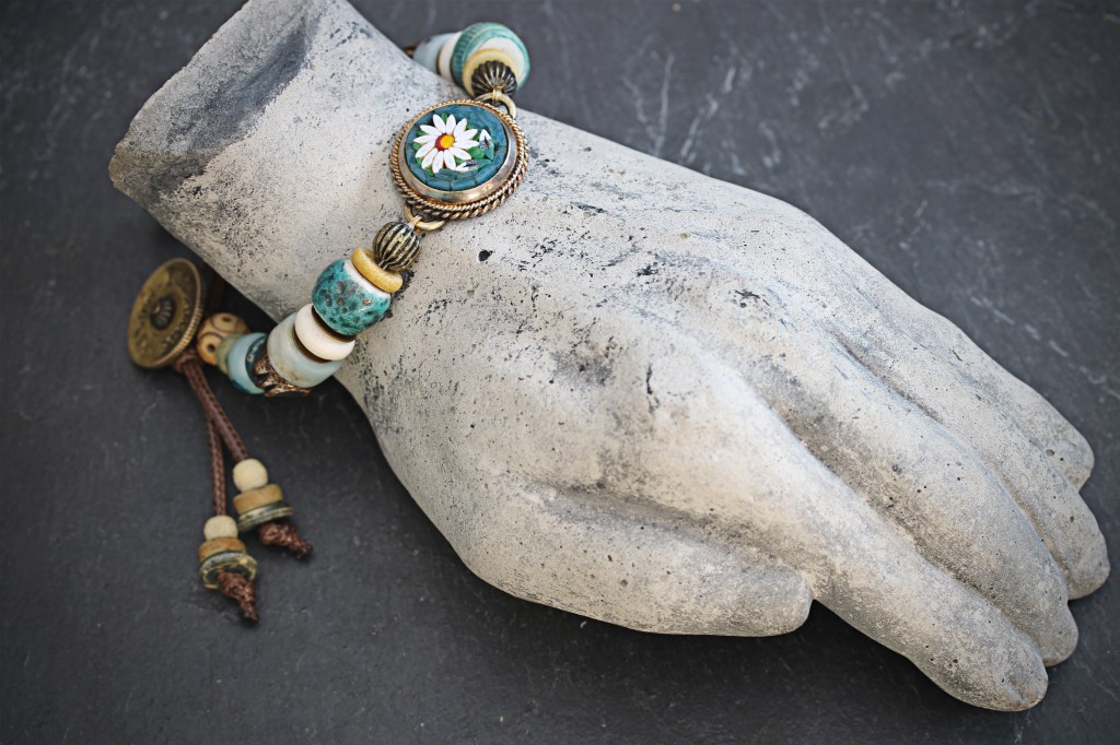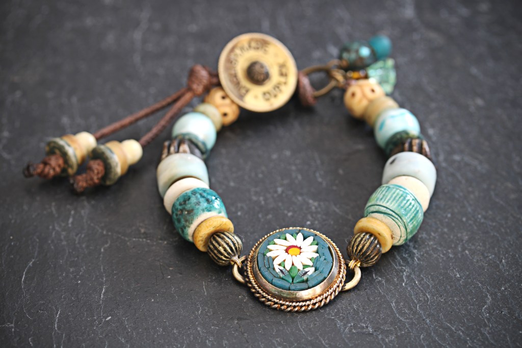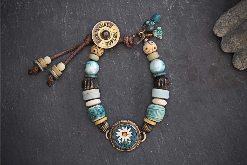 For the focal point of this bracelet I have taken a broken vintage micro-mosaic from Italy featuring a daisy on a teal background and re-soldered it with brass connectors that attached to the array of lost and found beads. From flea markets and broken jewellery, I have assembled carved mango wood beads, carved bone beads from a rosary, pearls and amazonite. Finally, I have matched these treasures with ceramic pottery beads that I have hand made myself and the bracelet closes with toggle created from a brass wick raiser I cut from a broken antique oil lamp made by Duplex.