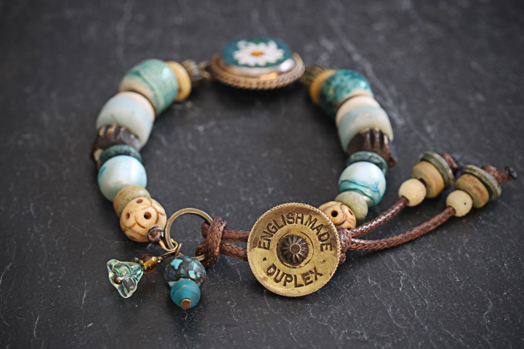 All of the items are either hand made by me, upcycled or reimagined and it all sits together on strong tiger tail wire and the brown chord is faux leather. It measures approx. 21 cm (about 8 inches in length). It would suit a wrist about 8 – 9 inches below the wrist bone.