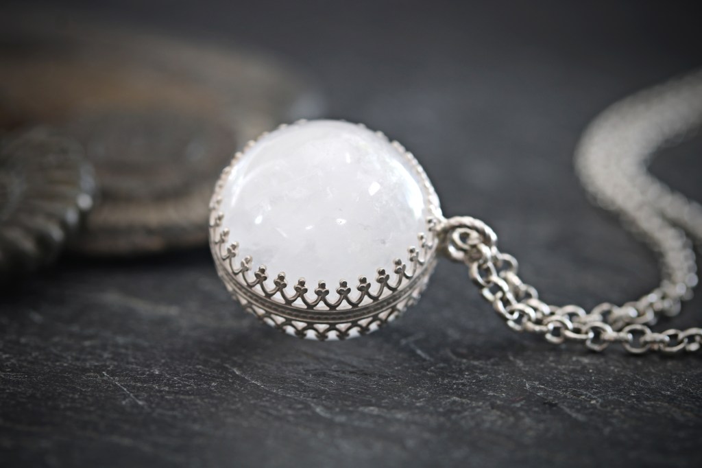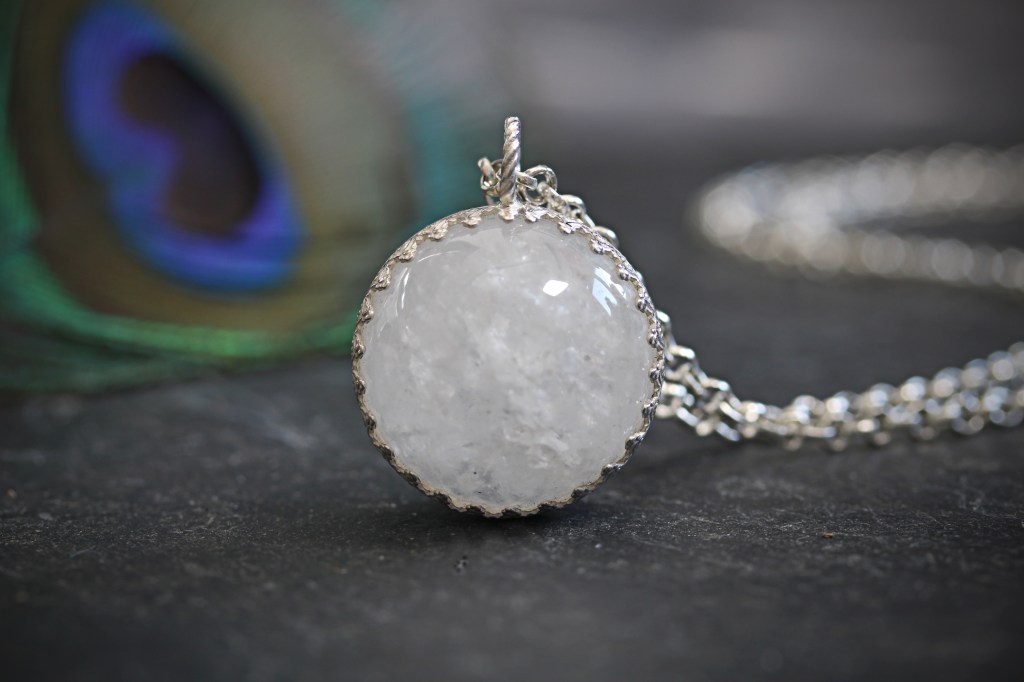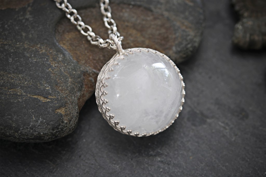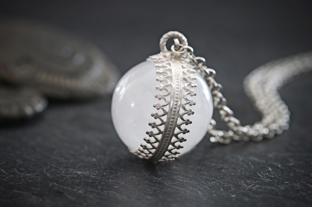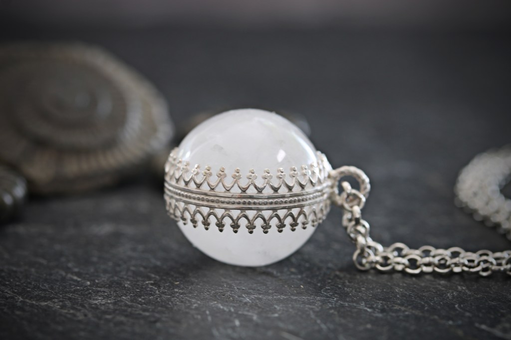This medium size white quartz polished crystal ball has some marvellous qualities, including interesting crystal formations within. The orb is slightly translucent when held to the light and has wonderful dusky tones. I have created and soldered a decorative sterling silver band around the sphere which hangs delicately on a sterling silver chain made from recycled silver.