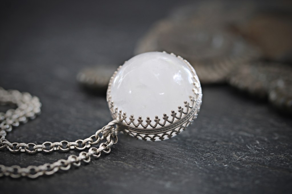It reminds me a little of the pool of light jewellery popular among 1920’s flapper girls and has a lovely cool feel to it. It is a medium size at 2 cm wide by 2.5 cm tall and would suit a medium to longer length necklace.