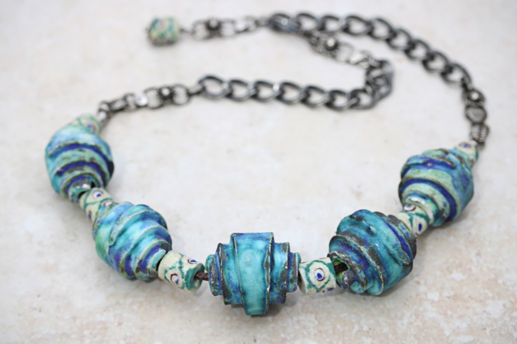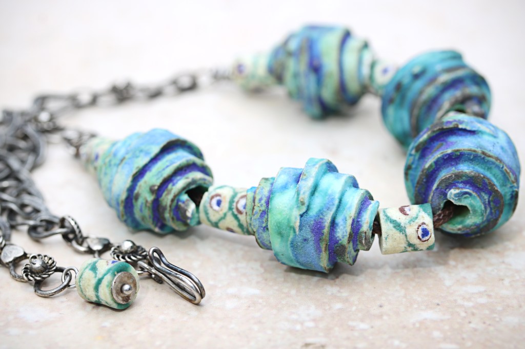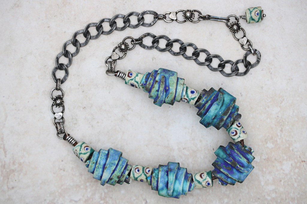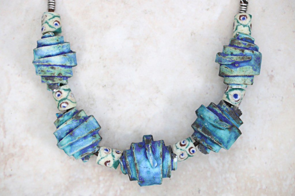 Make a bold, earthy statement with this handcrafted rustic assemblage necklace, featuring unique ceramic beads in textured folds and vivid turquoise-aqua hues. Each ceramic bead is individually shaped and hand-fired using a method reminiscent of croissant-making—folded from clay flats into organic, sculptural forms measuring approximately 2.7 cm by 2.5 cm.